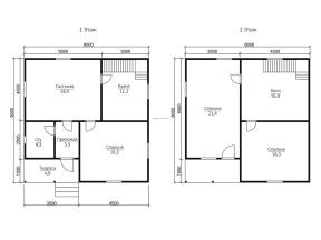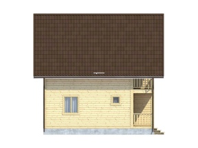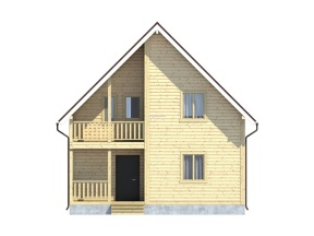 Проект 32 – оригинальное решение полутораэтажного дома из бруса с балконом. Общая площадь помещений по этому проекту –92.2 кв.м., размер дома – 8х8 м..