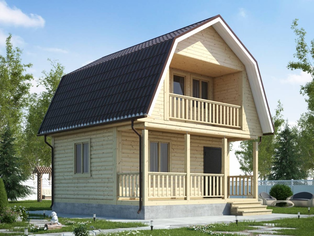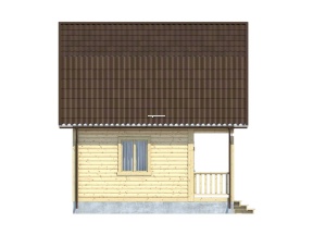 Проект 10 – оригинальное решение полутораэтажного дома из бруса с балконом и маленькой террасой. Общая площадь помещений по этому проекту –40 кв.м., размер дома – 6х6 м..