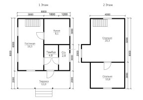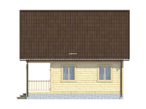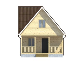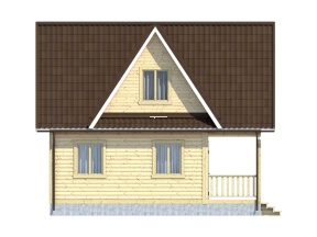 Проект 97 – оригинальное решение полутораэтажного дома из бруса с большой террасой. Общая площадь помещений по этому проекту –65 кв.м., размер дома – 6х8 м..