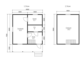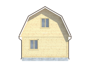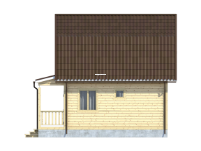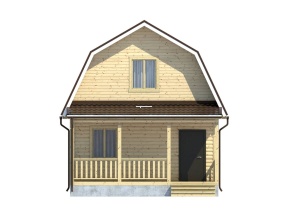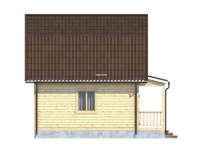 Проект 18 – оригинальное решение полутораэтажного дома из бруса с маленькой террасой. Общая площадь помещений по этому проекту –58.82 кв.м., размер дома – 6х7,5 м..