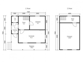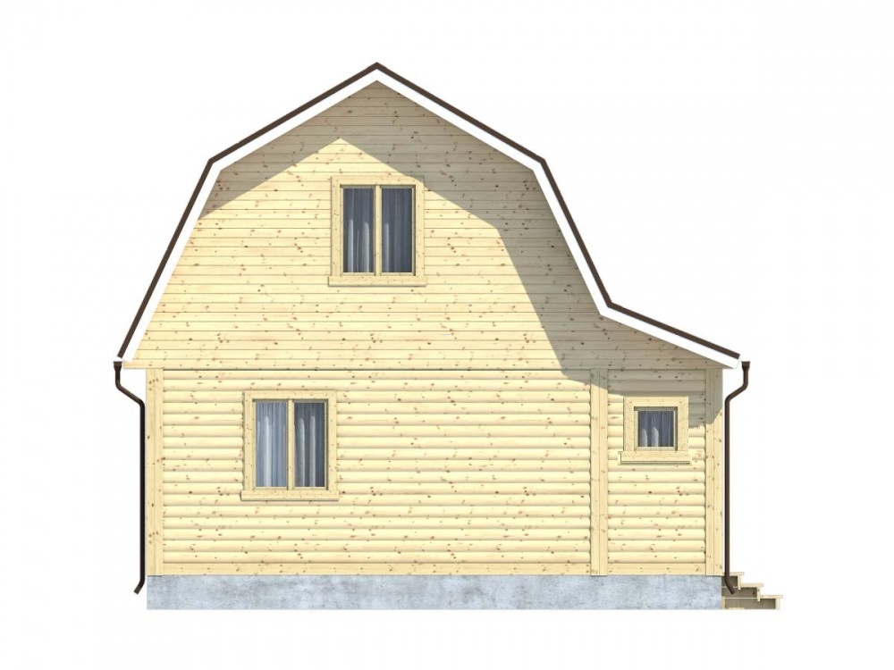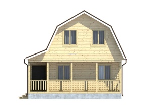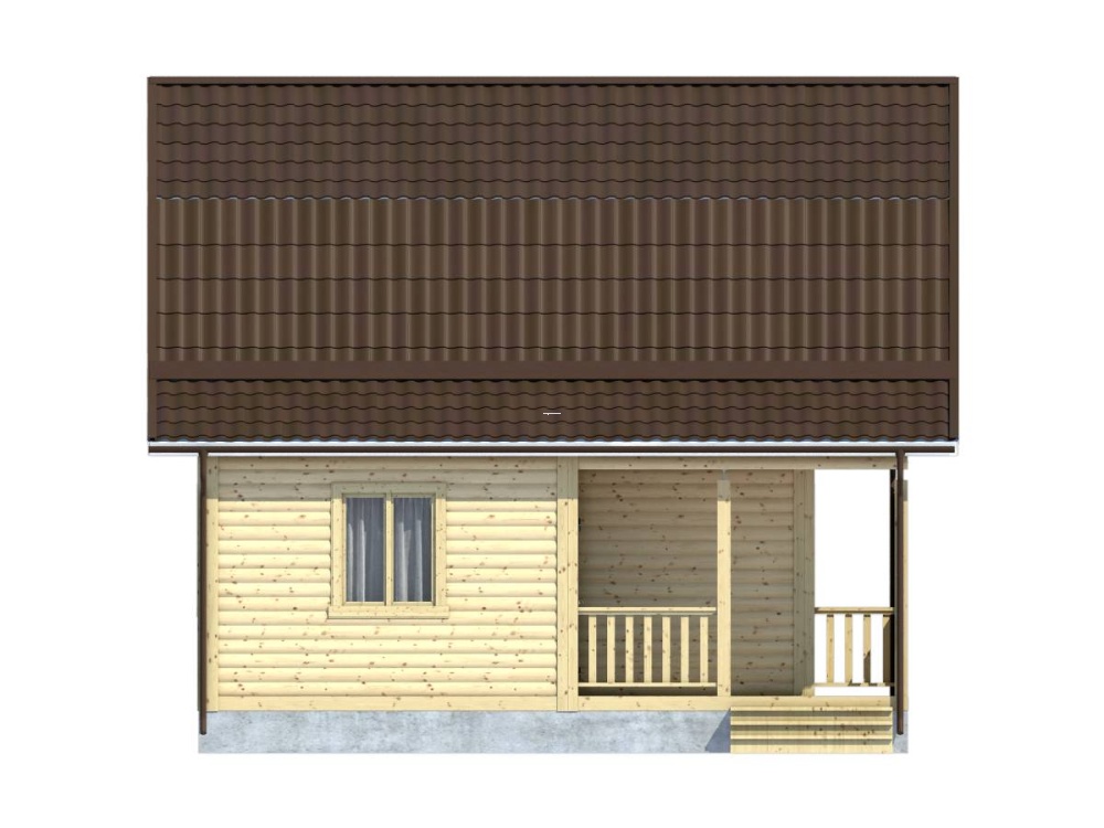 Проект 25 – оригинальное решение полутораэтажного дома из бруса с маленькой террасой. Общая площадь помещений по этому проекту –70.13 кв.м., размер дома – 7,5х7,5 м..