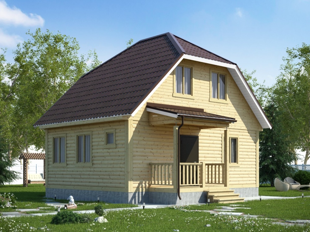 Проект 124 – оригинальное решение полутораэтажного дома из бруса с . Общая площадь помещений по этому проекту –71.6 кв.м., размер дома – 6х8 м..